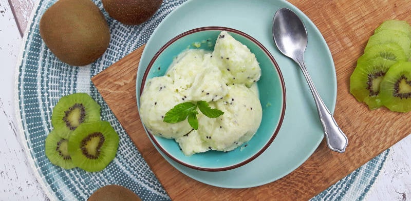 - Klop de eieren en suiker met een mixer luchtig. Giet het melk-slagroommengsel er bij en mix goed door elkaar. Mix tot slot de gepureerde kiwi's er door.