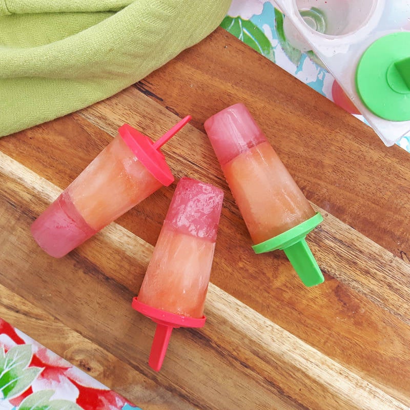 Eigenlijk wilde ik geel-oranje-rode ijsjes maken. Maar ik had er niet bij stil gestaan dat de stokjes vastvriezen zodra de ijsvormpjes halfvol zijn! En dan kun je de ijsjes natuurlijk niet meer verder vullen... :-) Dus werden het ijsjes met twee kleuren. Net zo lekker, hoor!