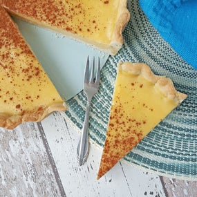 Een Zuid-Afrikaanse melktert, die stond al lang op mijn bak-verlanglijstje. Dit weekend had ik een mooie reden om 'm eindelijk eens te maken: de collega's van mijn man hadden wel weer eens zin in een taartje. En ik had alleen basisingrediënten in huis. Lekker toevallig, want daar kun je dus precies een melktert mee maken! :-)