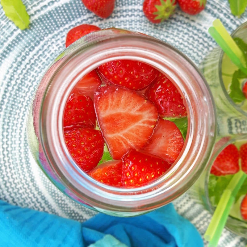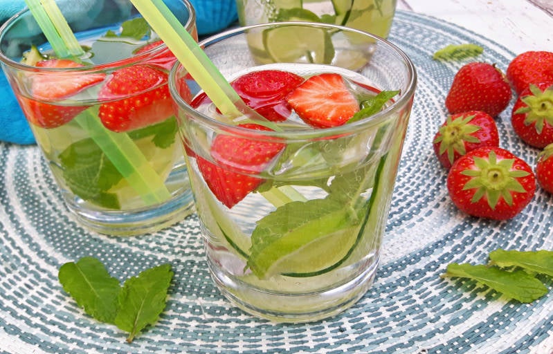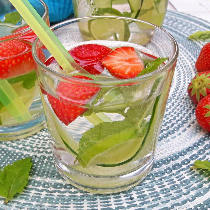 - Doe het water samen met de plakken komkommer, schijfjes limoen, de aardbeien en de munt in een karaf.
