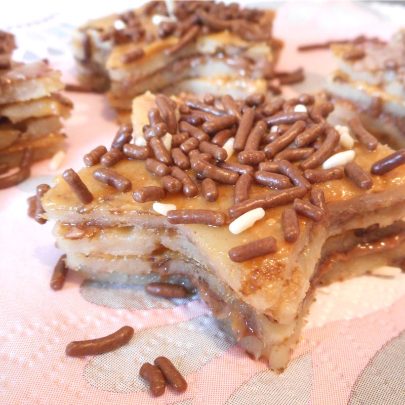 - Maak nu stapeltjes met elk vier sterren: eerst een ster met pindakaas, dan één met chocopasta, vervolgens weer eentje met pindakaas en tot slot eentje met chocopasta.