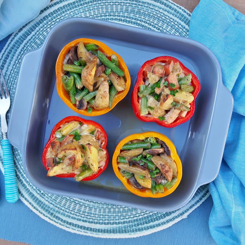 - Verdeel de aardappeltjes, sperziebonen en kipfilet over de vier paprika's.