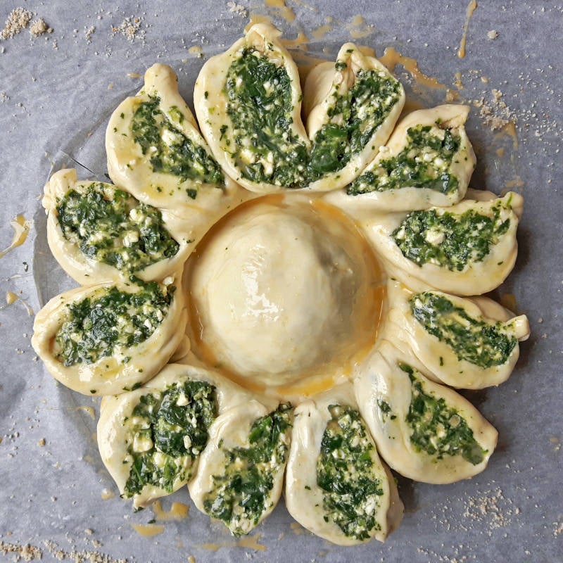 Je kunt natuurlijk allemaal kleine spinazie-feta hapjes maken... maar je kunt er ook een grote bloem van maken! En eigenlijk is dat ook nog sneller gemaakt (ook handig, toch?). Hij is zowel warm als koud heel erg lekker.