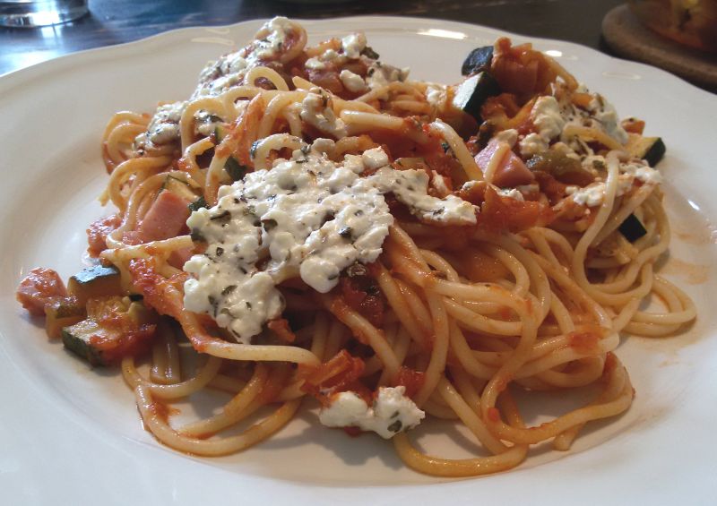 - Verdeel de cottage cheese over de spaghetti.