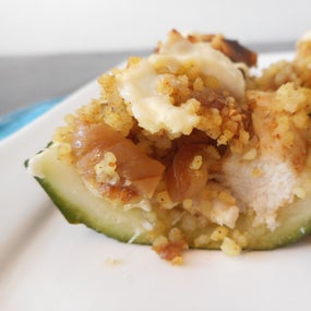 - Meng de kip, ras al hânout, koriander, kaneel, vijgen en dadels door de couscous. Verdeel het mengsel over de vier halve courgettes. Schep daar boven op de cottage cheese of geitenkaas.