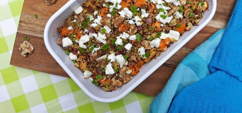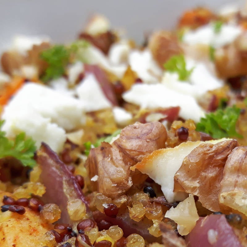 Gekruide quinoa met kip, zoete aardappel, noten, rozijnen & geitenkaas. Klinkt goed, toch? Wij vinden deze ovenschotel in elk geval erg lekker. Hoe eet jij quinoa meestal?