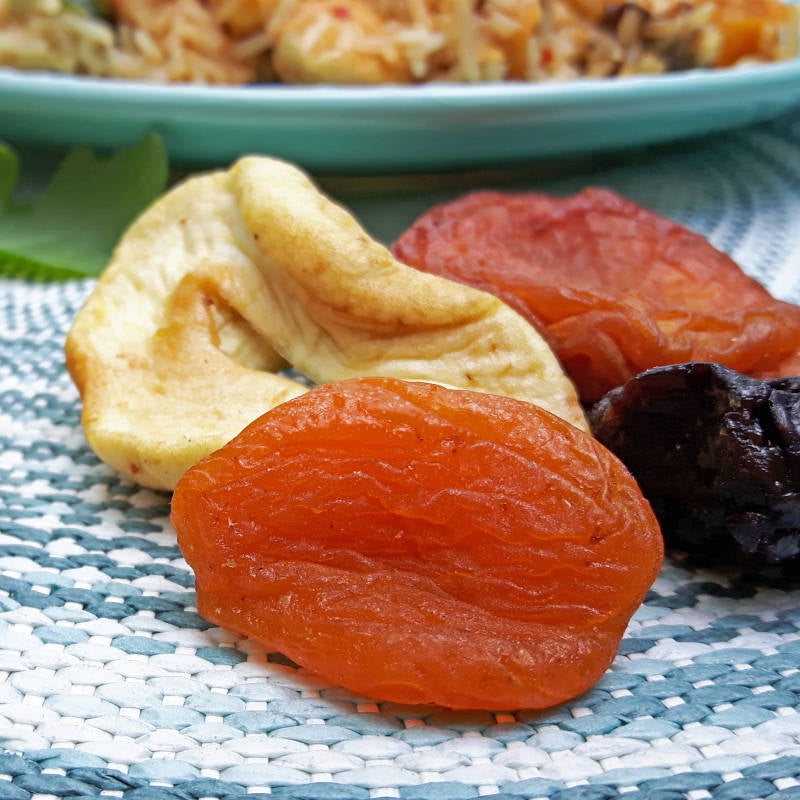 Meestal maak ik dit soort maaltijden omdat er een ingrediënt in de voorraadkast of koelkast ligt dat hoognodig op moet. In dit geval was dat dus het gedroogde fruit, waarmee ik eerder al een zoete Marokkaanse stoofpot in de tajine maakte. Dat was trouwens ook erg lekker! En nu we het daar toch over hebben: ik moet onze tajine maar gauw weer eens afstoffen & gaan gebruiken. Want gerechten in de tajine, daar heb ik ook nog wel wat ideeën voor... :-)