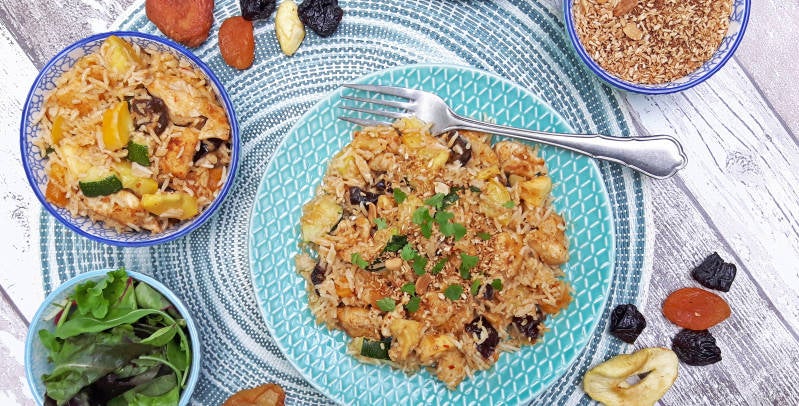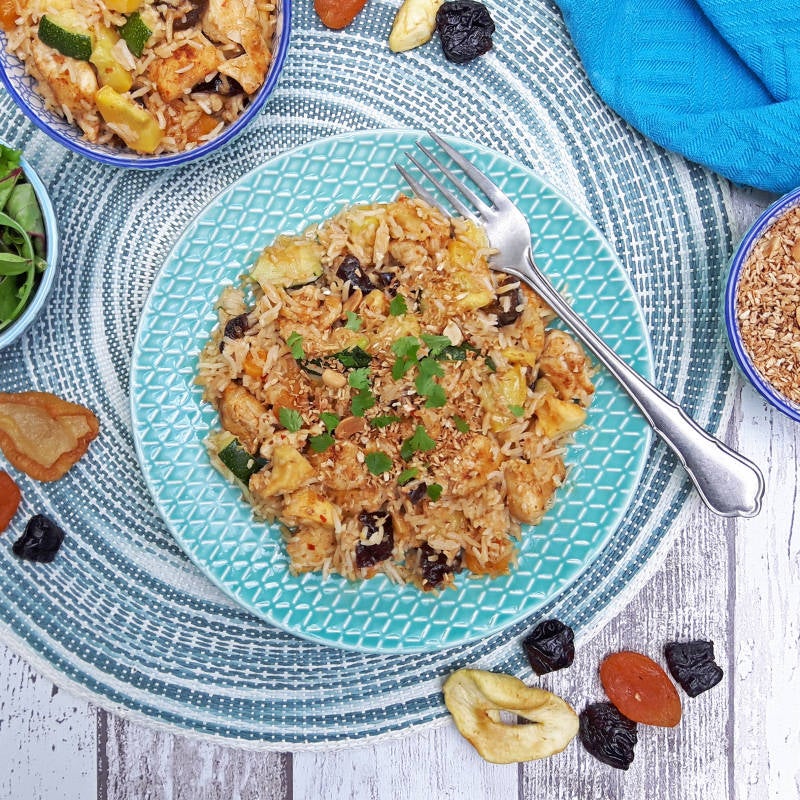 Pittig en toch zoet: deze spicy rijstschotel met kip & gedroogd fruit heeft het allebei! Ik gebruikte er een restje tutti frutti voor. En ik wist eigenlijk niet of 't lekker zou worden, maar het smaakte zo goed, dat het inmiddels al veel vaker op tafel heeft gestaan!
