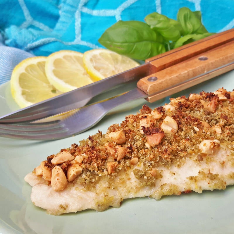 Vis met een lekker knapperig laagje! Op deze pangasiusfilet zit een krokante topping van pesto, noten & citroen. Dat heb je in een paar tellen gemaakt & daarna hoeft de vis alleen nog maar in de oven!