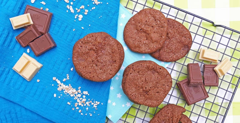 - Haal de bakplaat uit de oven en laat de koekjes even afkoelen op de plaat. Ze zijn nu nog heel erg zacht! Schuif de koekjes na een paar minuten met bakpapier en al op een rooster en laat ze daar helemaal afkoelen en uitharden. Het worden stevige, knapperige koekjes!