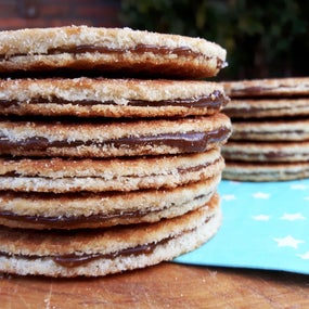 - Smeer op de ene helft een eetlepel stroop en druk de andere wafelhelft er op. Druk voorzichtig aan en laat de wafel daarna afkoelen op een rooster.