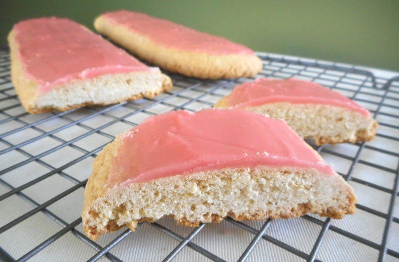 Een sûkerlatte (suikerlat) is een echt Friese koek met - de naam verraadt het al - lekker veel suiker er in. Ze zijn er zowel mét als zónder glazuur er boven op - en allebei heerlijk, al is die met de roze laag natuurlijk wel het aller-allerlekkerst! Toch? :-)