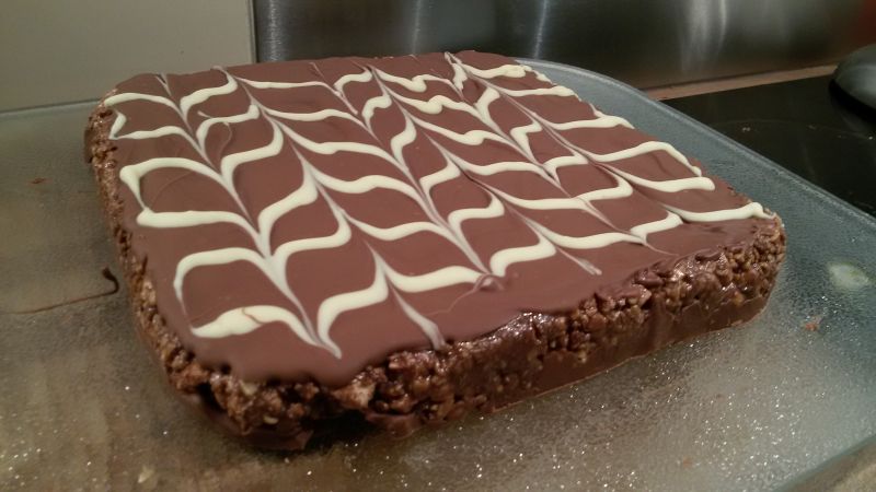 - Zet de koek nog een aantal uur in de koelkast (of even in de vriezer) om op te stijven. Snij hem daarna in ruitjes met een scherp mes.
