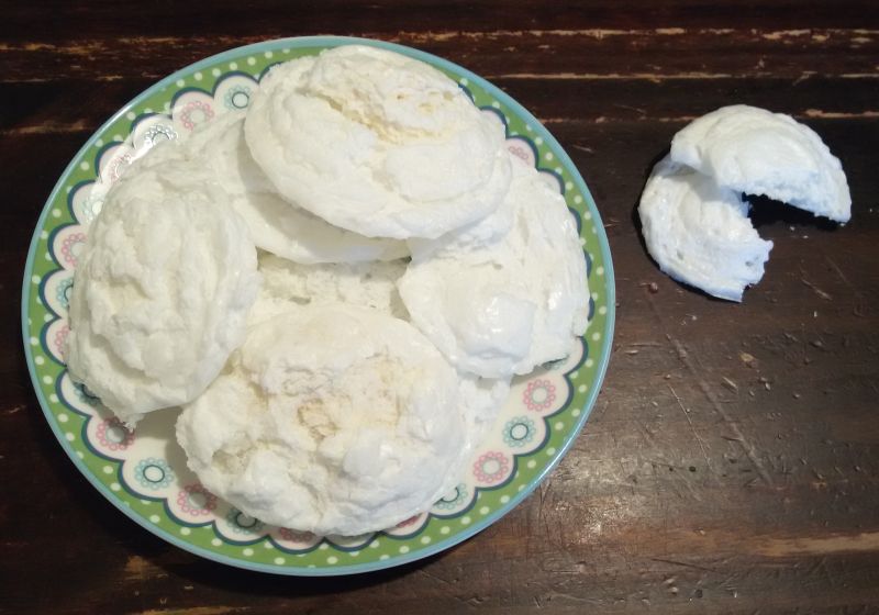 En het werkt inderdaad! In no-time heb je een aantal schuimpjes gemaakt. En zijn ze ook even lekker? Ja, op zich wel. Ik vind ze alleen niet zo mooi. Het worden nogal brokkelige schuimpjes, terwijl de meringues die ik in de oven klaarmaak mooie toefjes blijven. Die zien er veel chiquer uit.