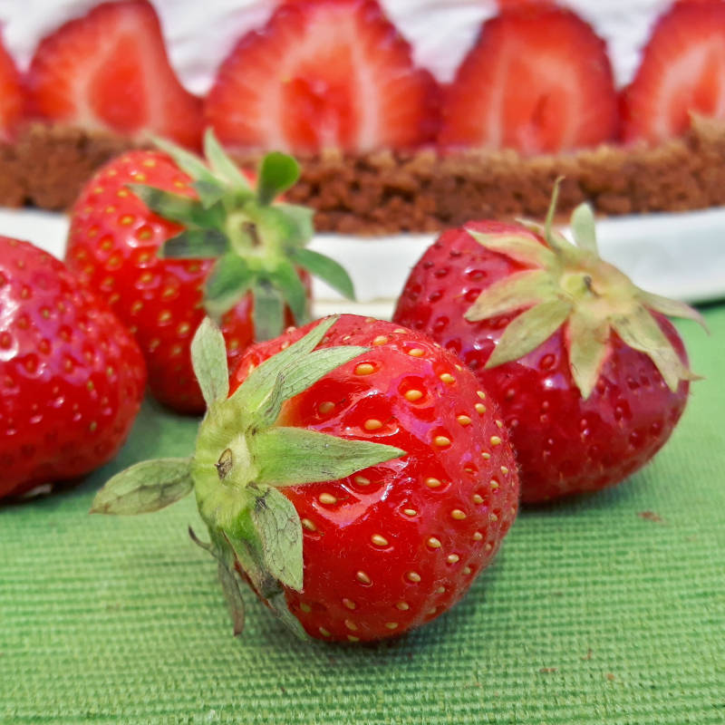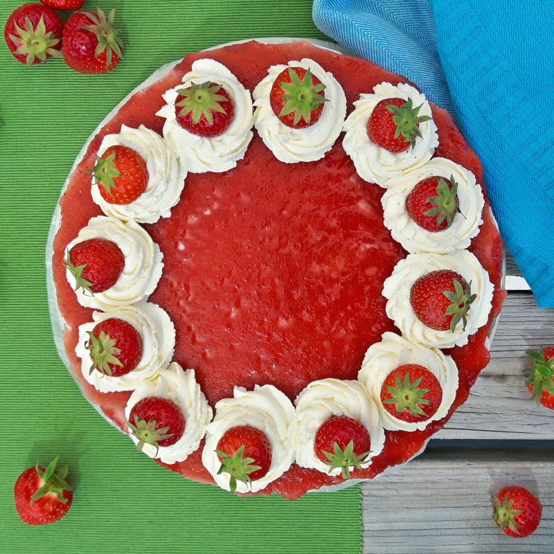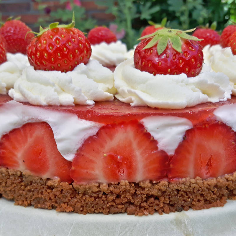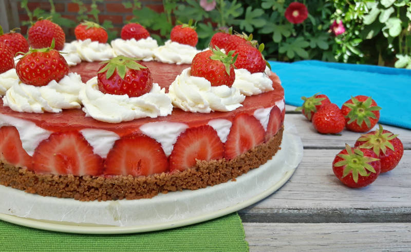 - Klop de slagroom, suiker, klopfix stijf. Schep het in een spuitzak en spuit 12 toefjes slagroom op de taart. Druk in elke toef een aardbei. Snijd de taart in 12 punten.