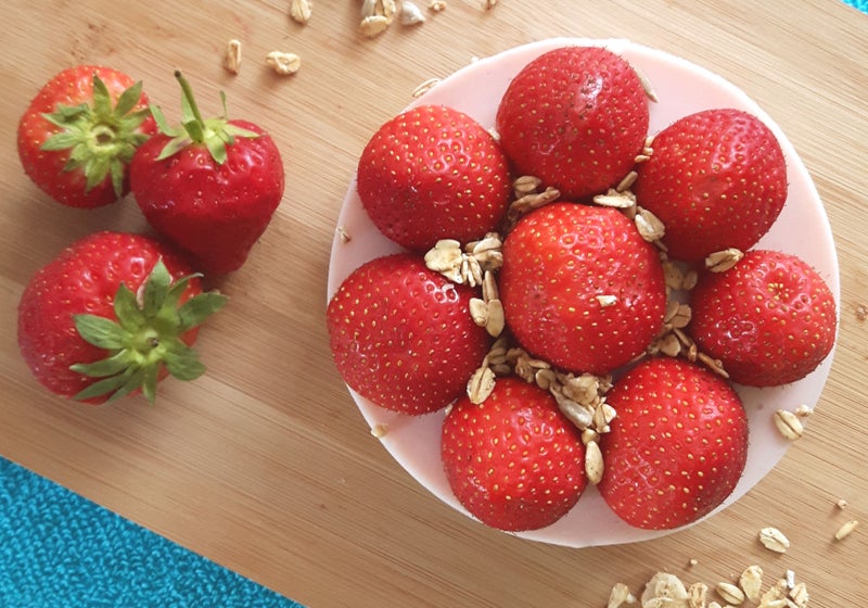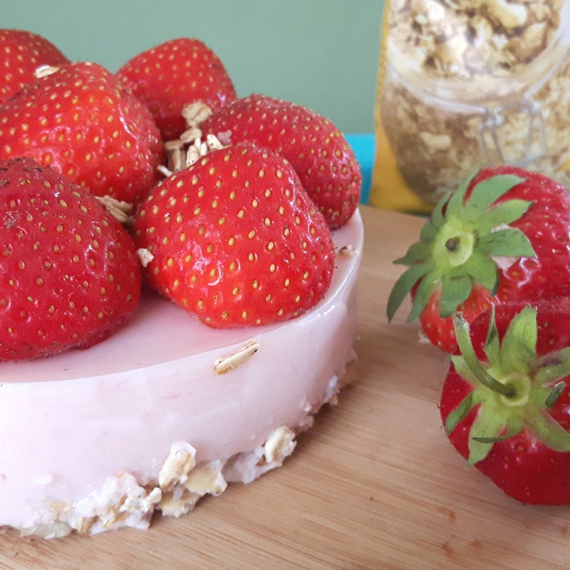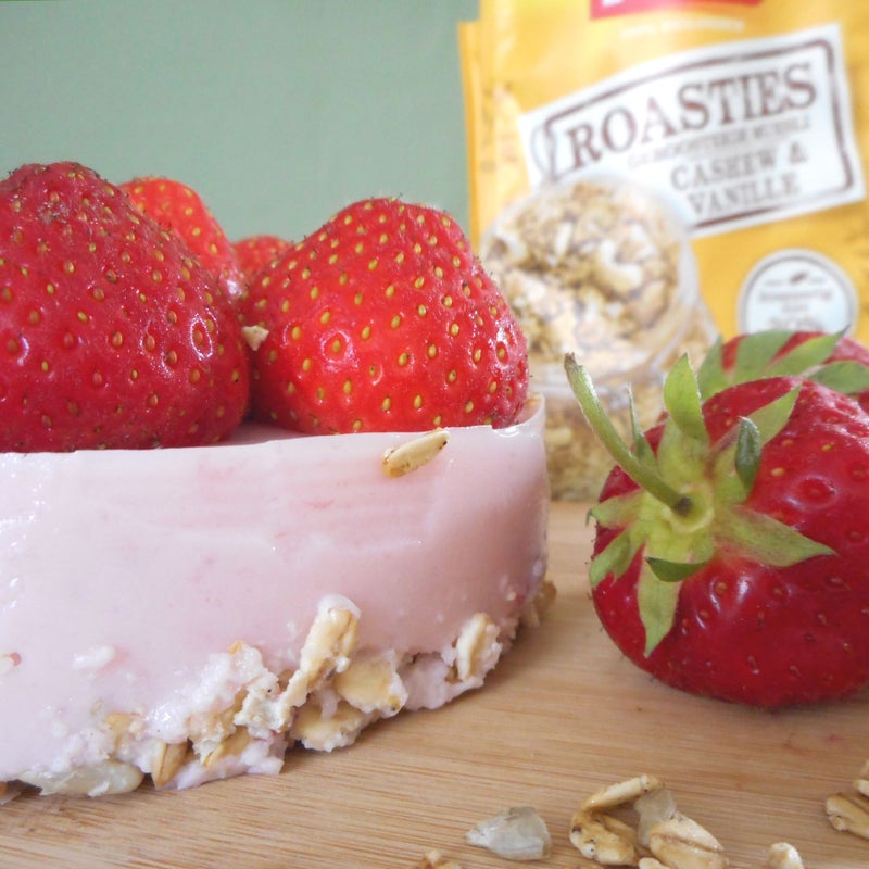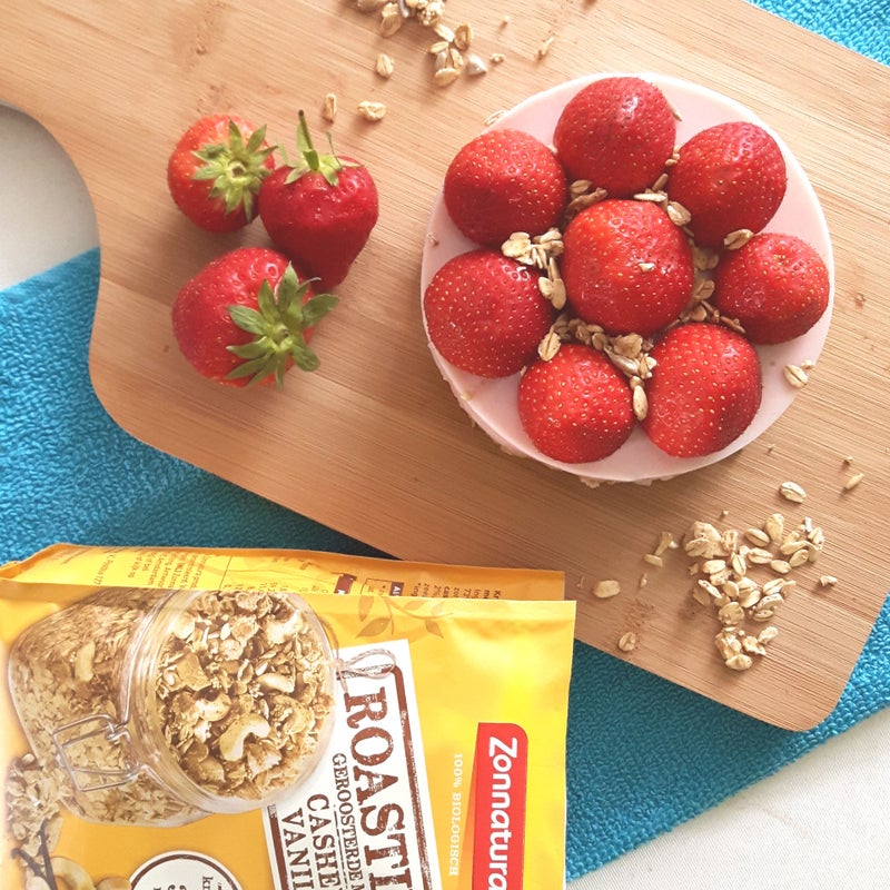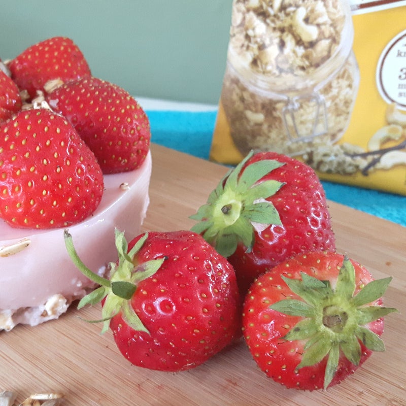 Wat vinden jullie: is dit nou een taartje, of een ontbijt? Wat mij betreft kan 'ie voor allebei: het smaakt als een gebakje en bevat allemaal gezonde ingrediënten: magere yoghurt, roasties & aardbeien.