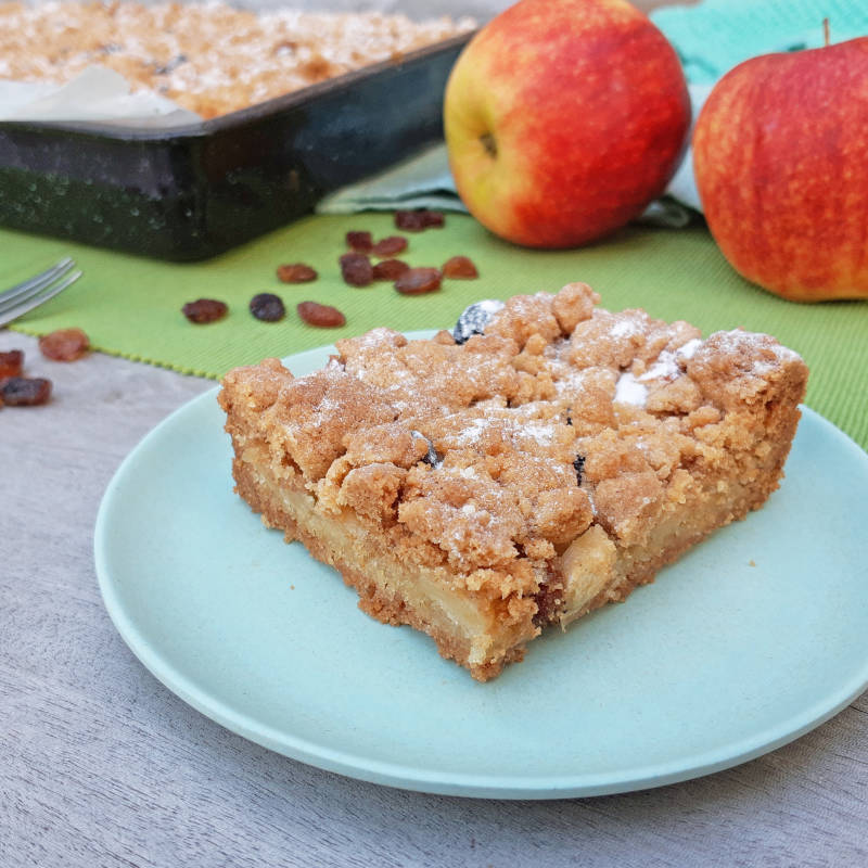 - Strooi de stukjes appel en de rozijnen over de spijs. Verkruimel de rest van het deeg hier weer over heen.