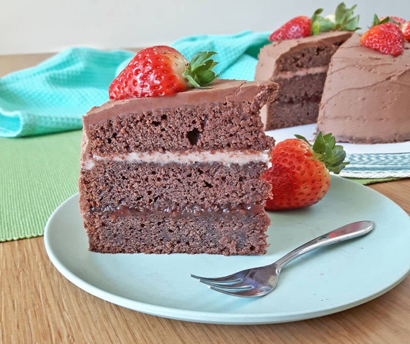 - Leg de onderste schijf op een bord of op een rond taartkarton. Smeer de jam op de cake. Leg de tweede cakeschijf op de schijf met aardbeienjam.