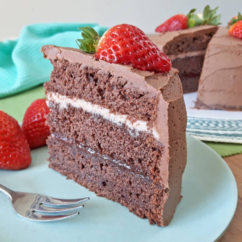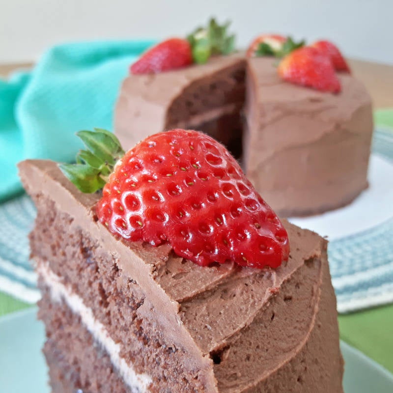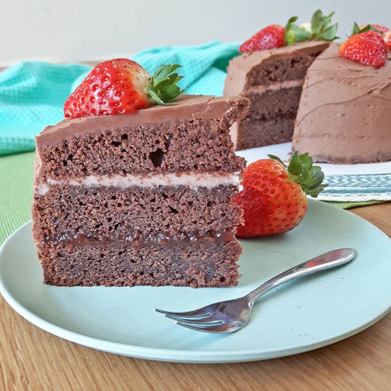 Chocoladetaart! <3 Met lekker veel laagjes: tussen de drie chocoladecakes zit eerst een laag jam en daarna zachte aardbeiencrème. Op de buitenkant van de taart zit stevige chocolade botercrème. Ik ben zelf trouwens niet zo'n liefhebber van chocoladegebak, maar déze taart vind ik ook erg lekker!
