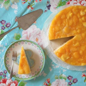 - Verdeel het fruit over de taart en laat daarna minstens 3 uur opstijven in de koelkast. Let op: schep het fruit pas op de kwarklaag als die helemaal stevig is! Anders wordt het een zootje :-)