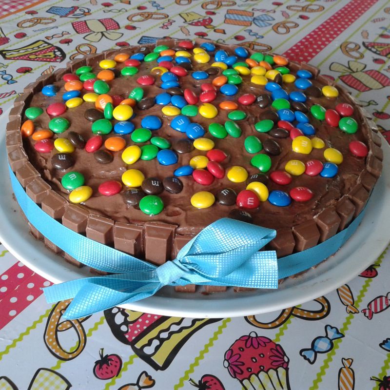 - Snijd de KITKAT's door de helft en zet ze rechtop rondom de taart. Strik het lint om de taart en bestrooi de bovenkant met de M&M's.