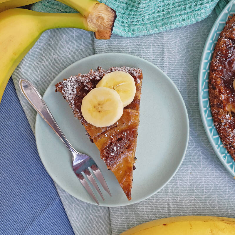 - Bestrooi de afgekoelde taart met wat poedersuiker en versier hem vlak voordat je 'm serveert met wat extra plakjes banaan.