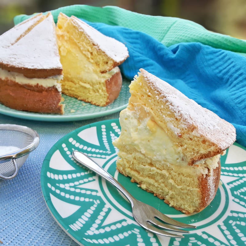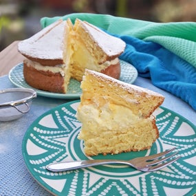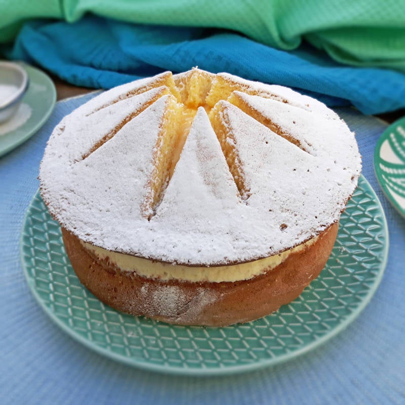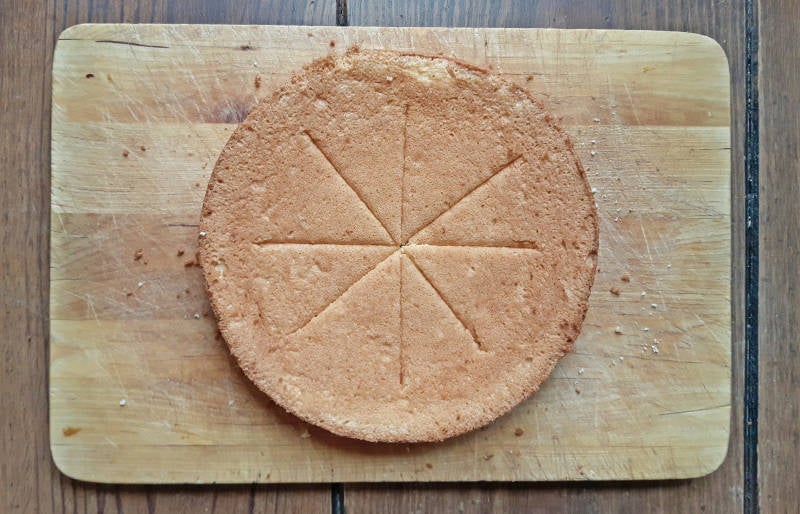 - Als de biscuit helemaal is afgekoeld snijd je hem in de lengte door de midden. Leg de onderste helft op een bord.