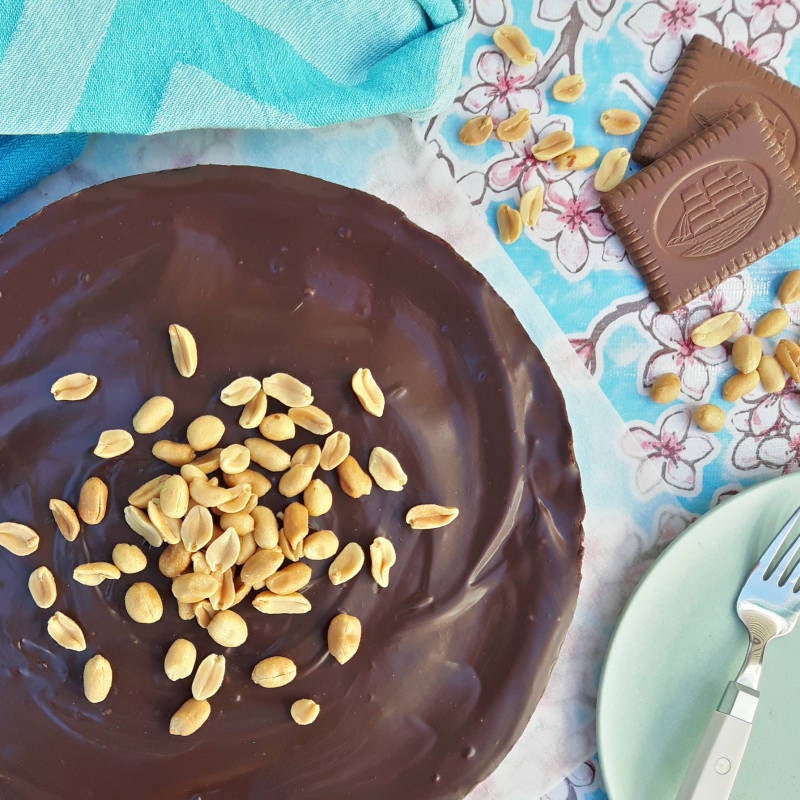 - Roer de pinda’s er doorheen en giet het mengsel daarna op de bodem van de taart. Zet de taart daarna 3 uur in de koelkast.