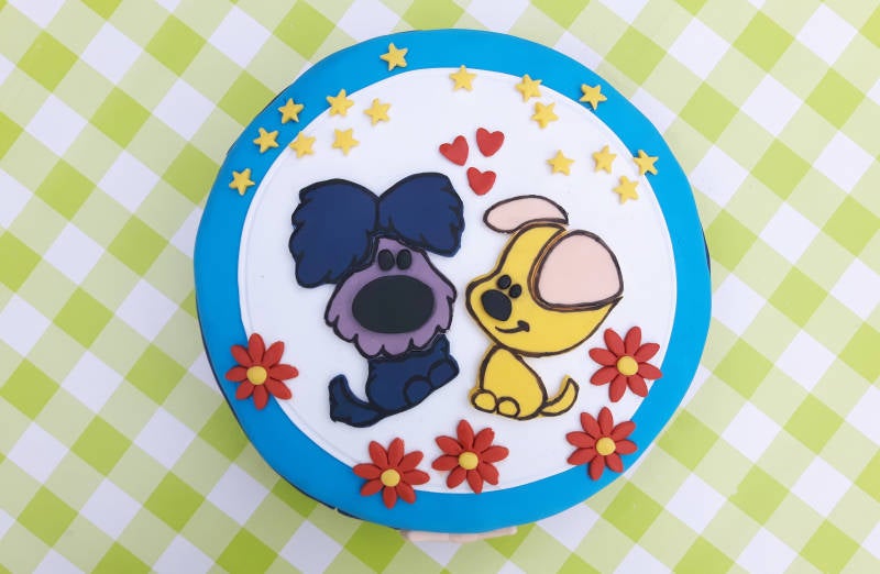 - Maak de fondant hondjes aan de onderkant nat met een beetje water en plak ze op de taart. Klaar! :-)