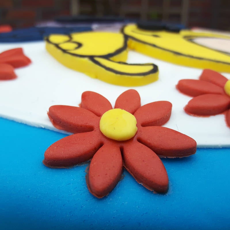 Zo'n stift met eetbare inkt is trouwens erg leuk. Daarmee wordt het een stuk makkelijker om herkenbare figuurtjes voor op een taart te maken! De stift kleurde overigens niet altijd even makkelijk; hij droogde wel eens wat uit en dan maakte ik hem een klein beetje nat. Daarna deed hij het weer. Fondant is denk ik een vrij lastige ondergrond om op te kleuren met zo'n stift. Maar het is gelukt!