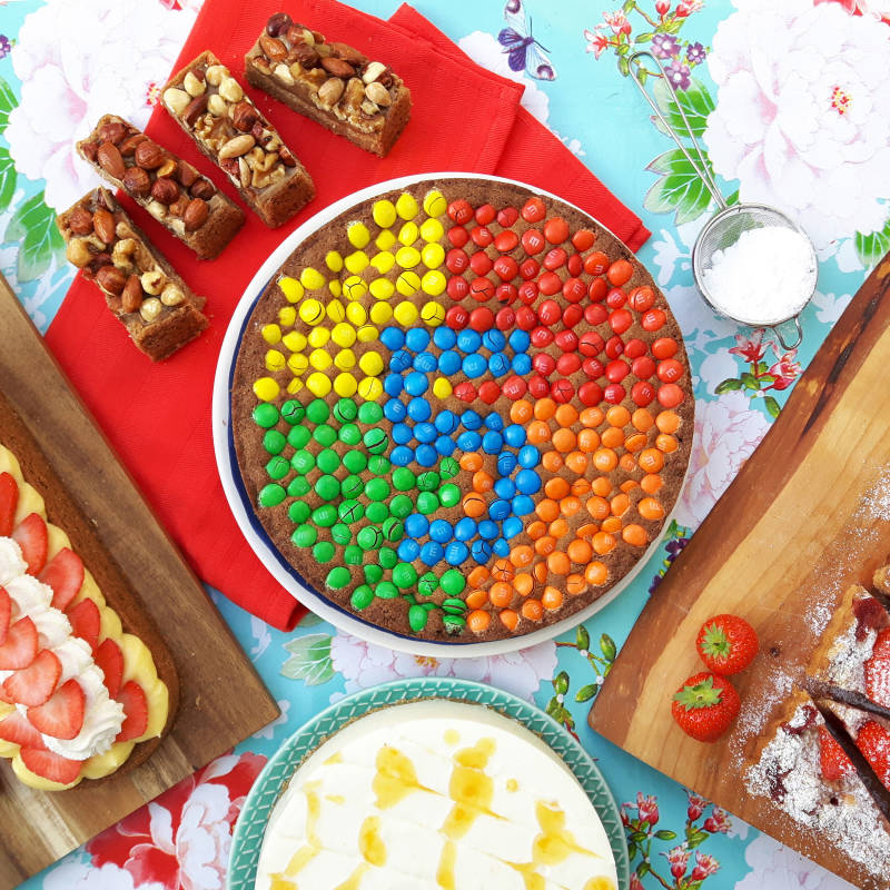 - Laat de M&M taart afkoelen voordat je hem in punten of vierkanten snijdt.