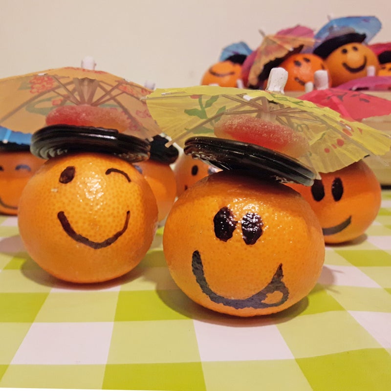 Hessel wist precies waar hij in de klas op wilde trakteren voor zijn 5e verjaardag: op mandarijntjes met gezichtjes, een perzikje, drop jo-jo en een parasolletje. Een beetje gezond én een beetje lekker!