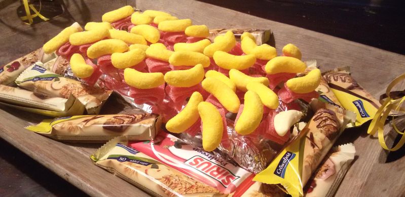 Dit jaar dus zure matten met banaantjes. Hij he-le-maal tevreden. En ik snel klaar. Win-winsituatie, toch? Voor de meesters en juffen deed ik er een mueslireep bij. Kunnen ze mooi in hun laatje leggen & nog even bewaren voor later.