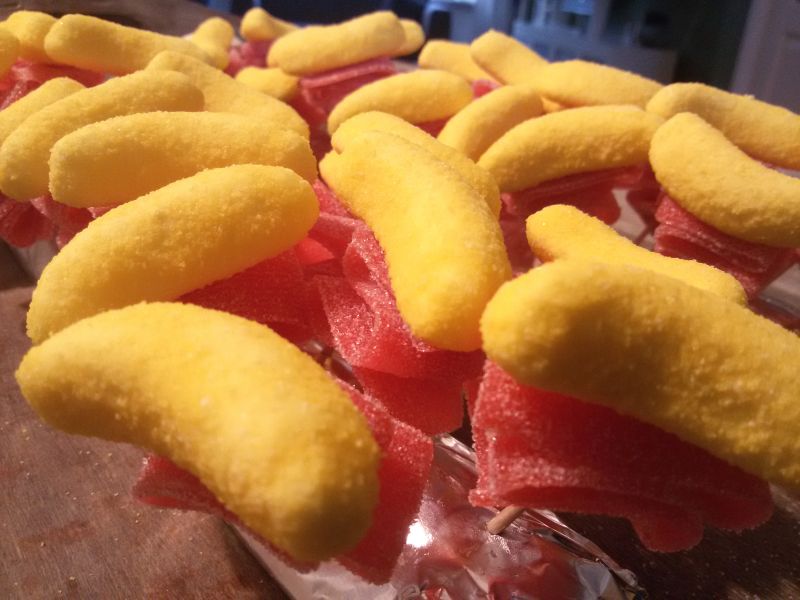 Nou ja, dit hoef ik eigenlijk niet uit te leggen, toch? :-) Doe de snoepjes op een prikkertje en prik die in de halve komkommer die in aluminiumfolie hebt gewikkeld. Klaar is kees.