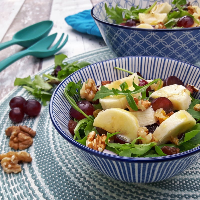 - Verdeel de druiven, banaan, ui, rozijnen en walnoten over de salade.