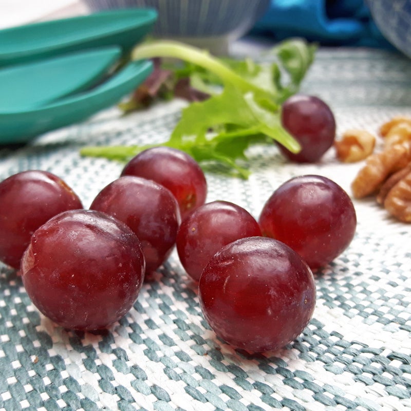 Wat is het mooi weer! Een perfecte dag voor een lekkere zomerse salade. Dit is één van mijn favorieten: druivensalade met banaan, walnoten, rozijnen, ui & een zelfgemaakte honing-mosterd dressing. Ik lunchte er mee, maar je kunt deze salade ook heel goed als bijgerecht bij het avondeten serveren.