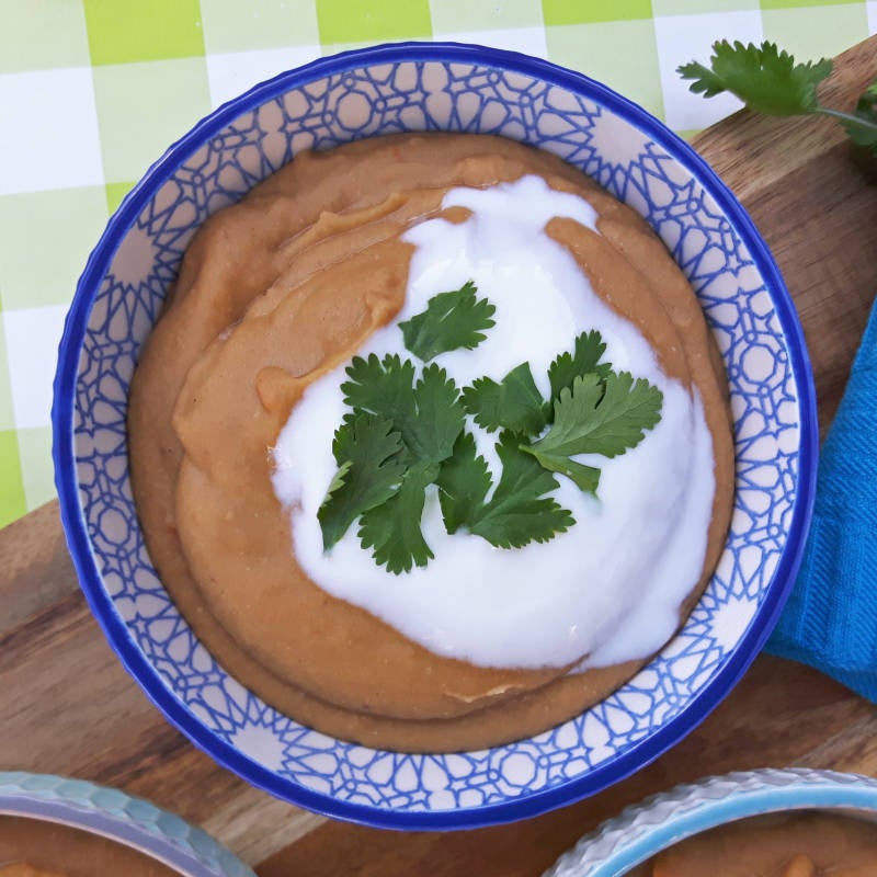 - Verdeel de soep over vier kommen en giet in elke kom een beetje magere yoghurt. Doe tot slot wat verse koriander in de soep.