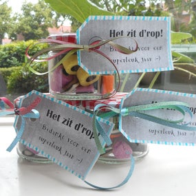 Deze hebben we voor dit schooljaar gemaakt: een droppotje met een label 'Het zit d'rop!'