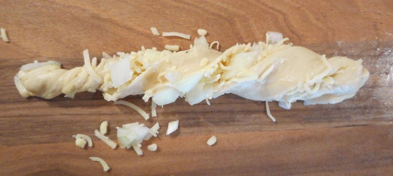 Deze gedraaide broodjes kun je met of zonder vulling maken. De uitleg hieronder gaat uit van een broodje met vulling (in dit geval kaas & ui). Wil je gedraaide broodjes zonder vulling maken, dan begin je bij stap 5: met allemaal dunne reepjes brooddeeg.