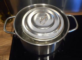 - Zet de boffertpan in een pan met koud water, dat tot ongeveer twee vingers onder de deksel van de boffertpan komt. De boffertpan moet niet drijven. Breng het water aan de kook en laat de boffert 1,5 - 2 uur zachtjes koken. Controleer regelmatig of de pan niet droog kookt; giet er eventueel wat water bij.